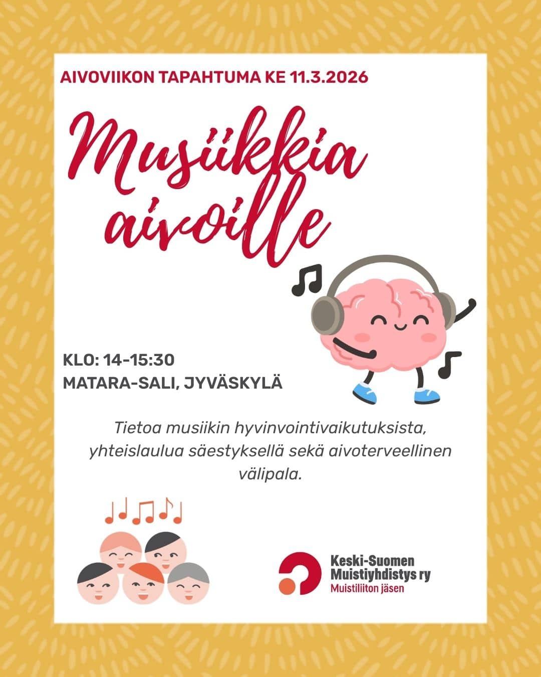 Aivoviikon tapahtuma ”Musiikkia aivoille”, järjestetään keskiviikkona 11.3. klo 14-15.30 Kansalaistoiminnankeskus Mataran Matara-salissa (Matarankatu 6 A1, 40100 Jyväskylä).