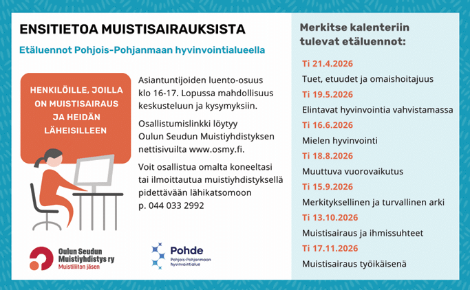 Osallistumislinkki löytyy Oulun Seudun Muistiyhdistyksen nettisivuilta https://www.osmy.fi/toiminta/ensitietoa-etana/